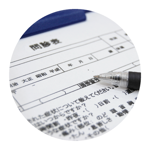 診察をお待ちの間に、問診票を記入していただきます。診察に必要な情報ですので、できるだけ詳しくご記入いただき、記入が終わりましたらスタッフへ提出してください。順番がきましたらお呼びいたしますので、それまで待合室でお待ちください。