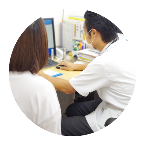 診察は個室にて行いますので話が他に聞かれることはありません。お聞かせいただいた症状により、処置や検査を先に行うこともありますので、スタッフの指示に従っていただきますようお願いいたします。病気のことでご不明な点がございましたら、ご遠慮なくお尋ねください。診察および検査が終わりましたら、再度待合室でお待ちください。